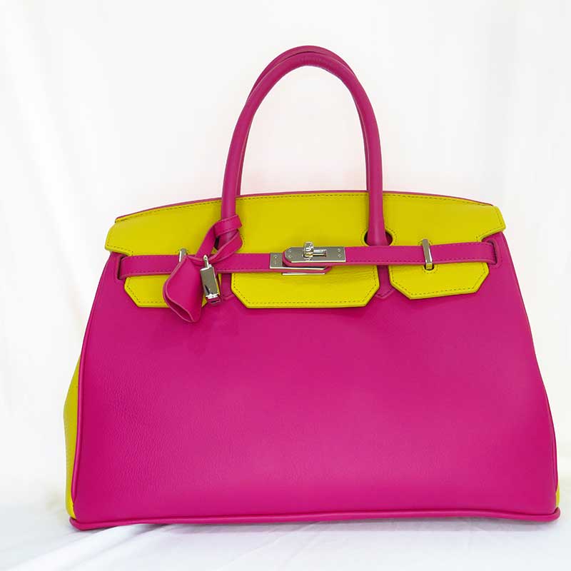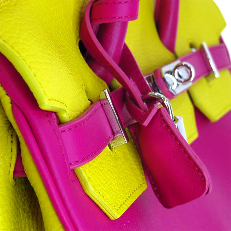Bolso tipo Birkin combinado en fucsia y amarillo, todo en piel, fabricado con mimo y cariño de forma artesana en nuestro taller de confianza de Ubrique.