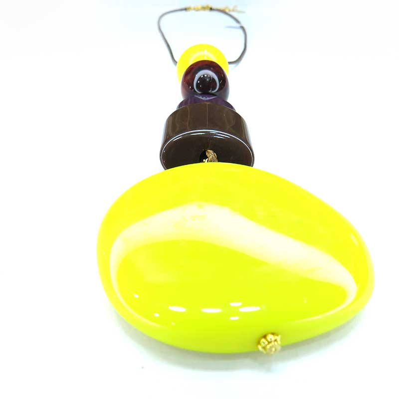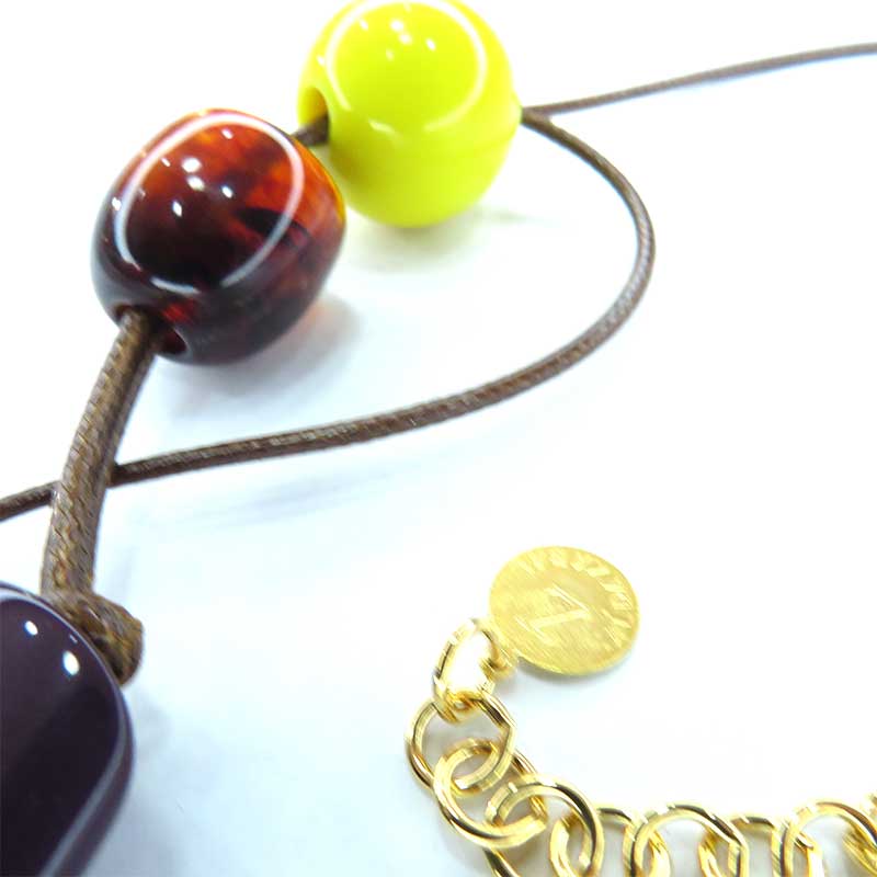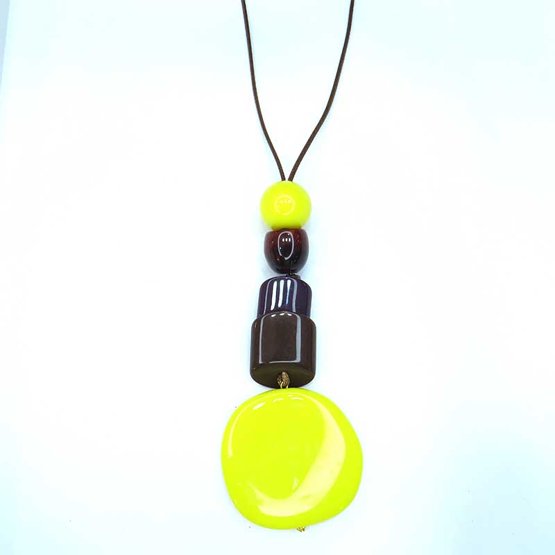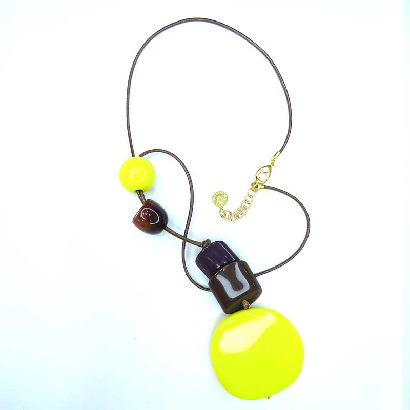 Collar largo de cordón marrón con piezas de resina en lima y marrones con pieza central grande color lima.