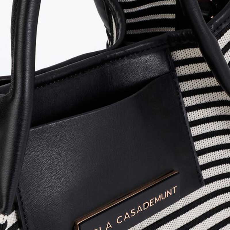 Bolso tipo cubo en tejido de rayas blanco y negro. Bolsillo exterior.