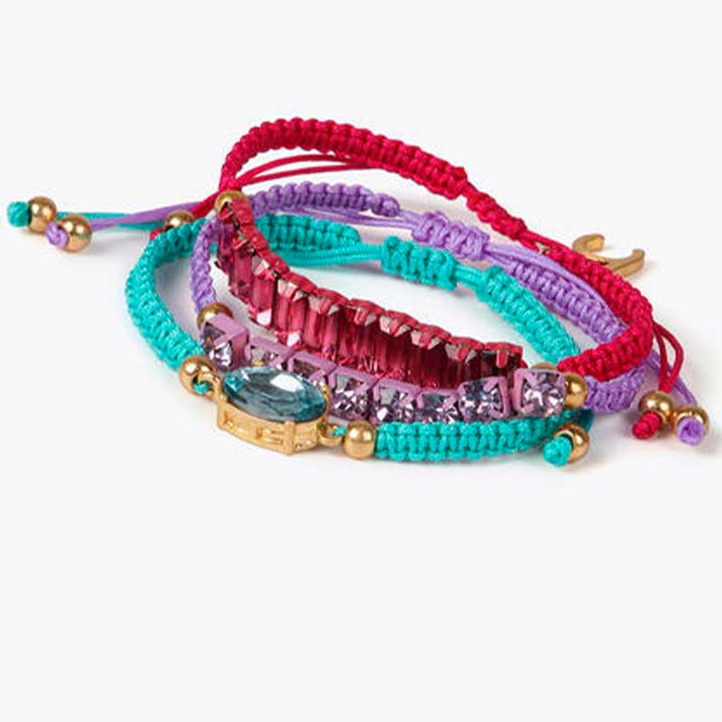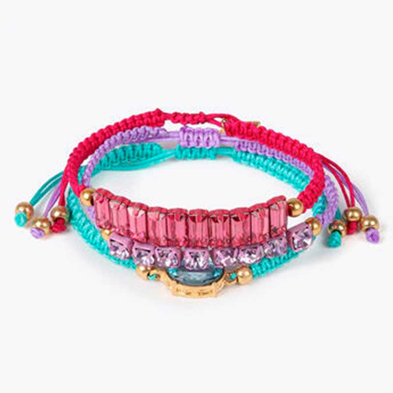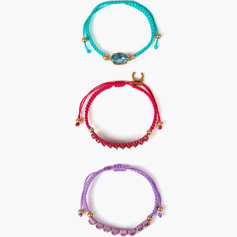 Pack  de tres pulseras macramé con detalles de cristales al tono y cierre de cordón ajustable.