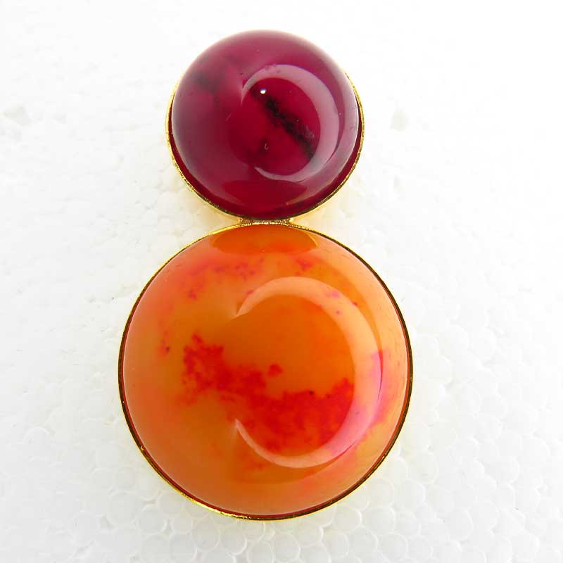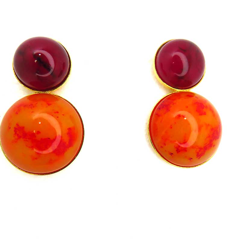 Pendiente largo con doble pieza de resina italiana sobre base dorada, en tono naranja y granate. Cierre tuerca.