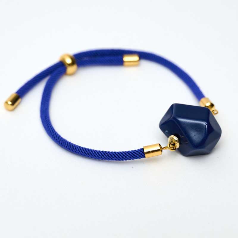 Pulsera ajustable de cordón y resina con detalles dorados.
